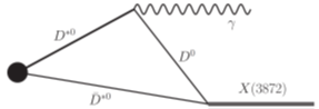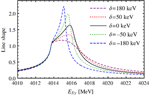 郭奉坤最近提出了一个全新的精确测量X(3872)的束缚能的方法,此方法甚至可以突破D*0和D0的质量测量误差(各仅为50keV)的限制,使得测量精度远超现有结果。方法的原理是:如图1所示,在高能粒子实验中产生一对正反D*0介子,其中一个(如D*0)放出一个光子辐射跃迁到基态的D0,D0再与反D*0发生反应产生X(3872)。在正反D*0介子对的质心系中,当总能量在一个特定区间的时候,D0介子的运动速度可以超过反D*0,如果它们沿同向运动,那么D0介子撞击反D*0从而产生X(3872)即可作为经典过程发生。此时,这个过程的振幅具有的所谓的三角奇点靠近物理区域,从而提升反应几率。该几率作为能量的函数(称为线形,实验上可测)对X(3872)的束缚能极其敏感(参见图2,其中为束缚能),从而我们可以通过测量X(3872)和光子的线形来精确确定X(3872)的束缚能。郭奉坤通过蒙特卡罗方法研究了要达到一定的测量精度所需要的事例数,发现利用该方法只需要几百个事例即可能将测量精度比现有结果提高一个量级。这一方法可以应用到任何可以大量产生S波正反D*0介子对的实验中,比如正负电子对撞、正负质子对撞等。