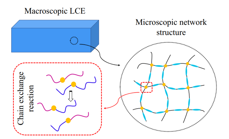 液晶弹性体的宏观形状变化与其内部微观液晶单元指向之间的耦合,使得通过调节液晶弹性体内部液晶单元的取向序进行机械做功成为了可能。液晶分子排列良好的单畴液晶弹性体具有非常优秀的机械性能,例如可逆的大应变变形、高强度和优异的韧性等。然而,由于随机淬火效应难以实现液晶单元的均一排列以及该材料的不可回收性(与其他常见热固性材料类似),液晶弹性体至今无法在工业中广泛应用。为了克服上述困难,键交换型液晶弹性体在2014年被成功制备;与液晶弹性体中交联键能垒很高导致交联键很难重组不同,键交换型液晶弹性体中的键交换反应速率可以通过加入催化剂和改变温度等手段调节。尽管现阶段在制备不同的键交换型液晶弹性体方面取得了显著的实验进展,但仍然缺乏理解此类液晶弹性体物理特性的理论框架,而构建此理论的主要困难来源于动态演化的向列序,聚合物材料的熵弹性和键交换反应引起的能量耗散等多种物理因素耦合。