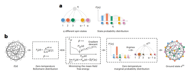 图2:(a)每个变量可以有q个不同的状态取值(左),状态取值的概率由边际概率分布确定(右)。(b) 组合优化问题的最优构型可以通过变分平均场自由能最小化结合退火的方式进行推断得到。