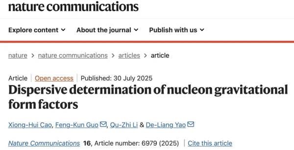 近日,由ld体育网页端 曹雄辉助理研究员、郭奉坤研究员,四川大学李衢智助理研究员和湖南大学姚德良教授组成的研究团队在Nature Communications上发表了题为“Dispersive determination of nucleon gravitational form factors”的研究论文,首次利用模型无关的方法,精确确定了真实世界中核子的引力形状因子。