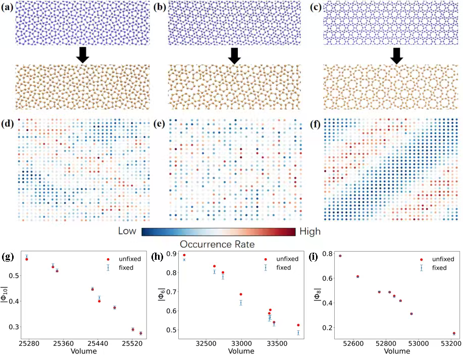 基于上述结果,该课题组进一步系统研究了球棍多边形体系固-固相变的动力学路径。作者通过分子动力学模拟发现了取向场中不同的缺陷模式:在升温导致相变的过程中,如图 1(d)-(f)所示,球棍五边形取向场中的缺陷形成模糊的条带与若干散点;球棍六边形取向场中的缺陷呈现随机分布的状态;球棍八边形取向场中的缺陷形成鲜明的条带。为了厘清背后的机制,作者通过固定质心的模拟研究了相变过程中的动力学路径。固定质心模拟反映了在给定体积和质心位置固定的条件下,体系的转动序参量在体系达到平衡态时的取值,通过与实际动力学轨迹中该序参量的取值进行比较,可以找出动力学过程中起主导作用的运动模式。如图 1(g)-(i)所示,球棍五边形的动力学路径由转动主导,球棍六边形的动力学路径由平动扩张主导,而球棍八边形平动与转动同步。
