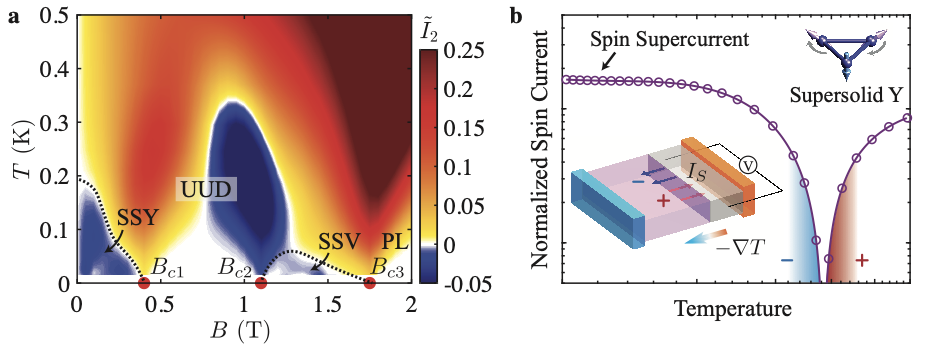 在理论方面,为研究阻挫量子磁性体系中的自旋塞贝克效应,需要精确计算有限温度下的自旋动力学,具有很大的挑战性。为解决这一问题,团队提出了一种基于虚时间近似(imaginary-time approximation)的张量网络算法 [4,5],可以精确高效地计算低温下阻挫磁体的自旋塞贝克效应。基于这一方法,团队研究了三角晶格易轴反铁磁海森堡模型,利用自旋流计算结果得到系统的磁场-温度相图(图1a),并预言了自旋超固态的自旋输运性质,为其实验探测提供了可行方案。