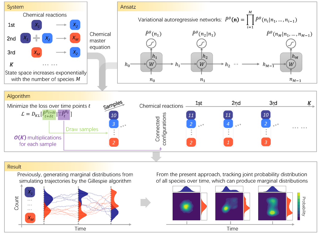 近日,中科院理论物理所彭桓武青年访问科学家、北京师范大学复杂系统国际科学中心的汤迎副研究员和学生翁佳钰与ld体育网页端 的张潘研究员合作,在Nature Machine Intelligence发表论文“Neural-network solutions to stochastic reaction networks”,提出了使用变分自回归网络来求解化学主方程的机器学习方法,提出用变分自回归神经网络(VAN)[1] 来研究随机反应网络中物种分子数的联合概率分布,刻画联合分布演化并求解化学主方程(图 1)。VAN是张潘研究员与合作者于2019年提出的神经网络变分方法,能够对统计物理微观构型进行有效采样,并计算不同构型的归一化概率,已被应用于统计物理学、量子多体系统、开放量子系统、量子电路和计算生物学。这项工作扩展了VAN以表征随机反应网络中物种分子数的联合概率分布。作为VAN的神经网络单元,作者采用了递归神经网络(RNN)和Transformer架构,它们可以灵活地表示高维概率分布并灵活调整物种分子数的上限。拓展的VAN也允许对每个物种添加物种分子数上限的约束,或者维持某些系统中物种分子总数守恒的约束,这都可以收缩概率空间以提高计算的准确性。新方法采用强化学习框架中的策略梯度算法训练自回归网络,不需要使用其他方法先验模拟的任何数据,给出了一个自动归一化分布作为任意有限时间内化学主方程的解,得到随时间演化的联合分布,提供了高维状态空间中每种构型在不同时刻的概率。此外,此方法在表示多峰分布方面表现出可塑性,对于物种分子数守恒的系统,具有随时间变化的反应速率的系统和高维系统均是非常有效的。