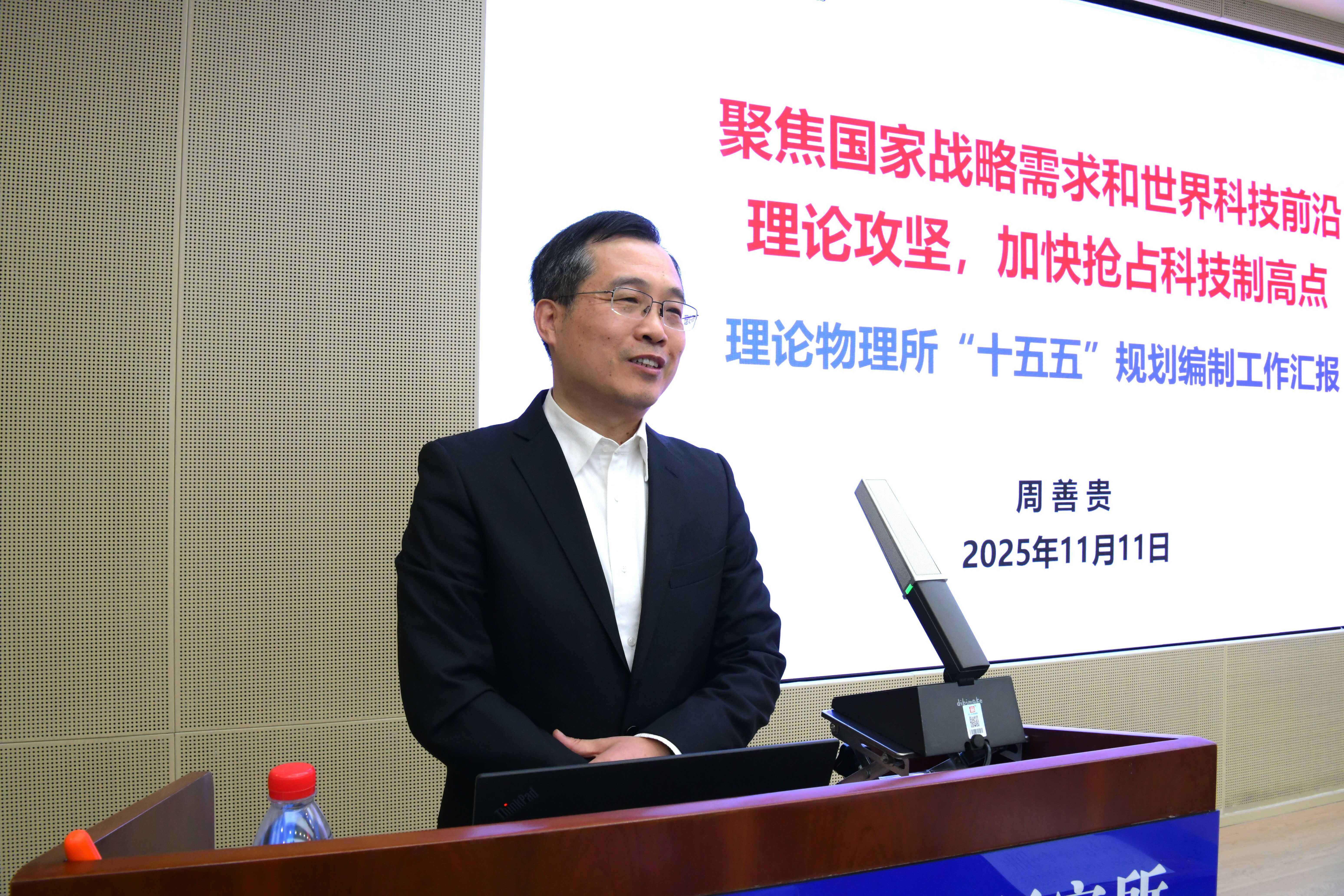 周善贵向与会人员详细汇报了理论物理所“十五五”发展规划,从发展态势、发展目标、基础优势、“十五五”重点布局、人才队伍建设以及体制机制保障等维度,系统阐述了未来五年的理论物理所的主攻方向、重点任务与实施路径。汇报既立足研究所现有优势,也充分考虑了当前面临的发展挑战,为后续的咨询讨论奠定了坚实基础。