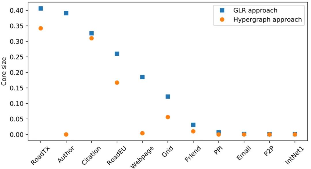 图一:GLR (普通网络化简方法 [1]);Hypergraph (超网络化简方法 [2]);Core (化简后网络的大小);横轴是不同的实际测试网络