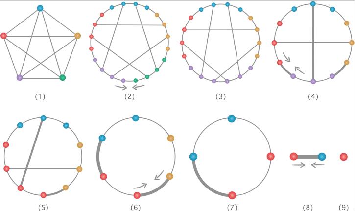 理论物理所研究员张潘和博士生潘峰,周鹏飞,李素洁提出了一种新的张量网络缩并方法,利用矩阵乘积态表述张量网络缩并中所产生的中间张量,并用密度矩阵重整化群进行有效的近似,压缩中间张量的维度,进而可以对任意张量网络进行缩并。下图是新方法对由5个4阶张量所组成的张量网络进行缩并的示意图:(1)中每个4阶张量被表示成(2)中的一个矩阵乘积态(MPS),然后不同MPS合并成更长的MPS,并采用低秩近似降低它们的维度,最后得到(9)中的缩并结果。新方法在统计物理自由能计算方面展现出强大的能力,在多种拓扑连接结构的自旋玻璃自由能计算问题中相比传统方法具有更高的计算精度和更快的计算速度。另外新方法可以以较小的计算误差对浅层量子线路进行经典模拟,具有模拟和验证含噪声的中型(NISQ)量子计算机的潜力。