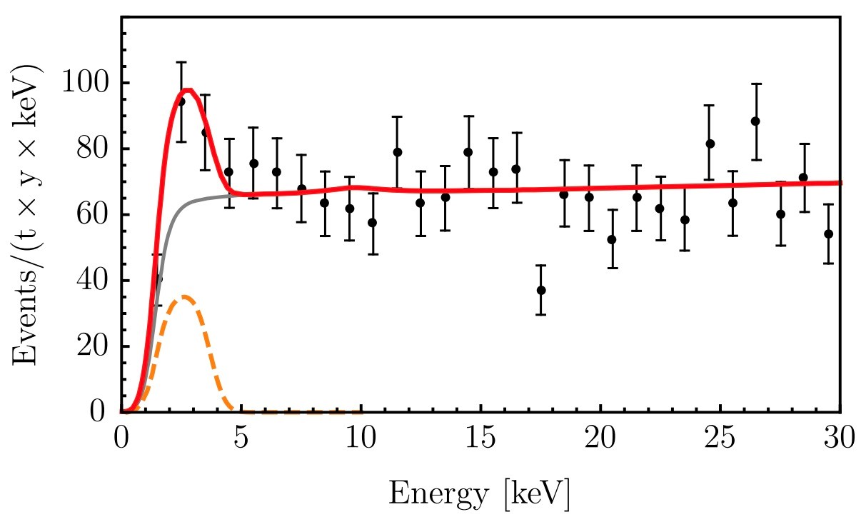 暗物质直接探测实验XENON1T位于意大利格兰萨索国家实验室地下,利用2吨重的液氙作为探测器,试图捕捉穿行其中,和原子核或者电子反应的暗物质踪迹。拥有极低的本底噪声以及吨级的靶,使得XENON1T给出过世界领先的暗物质限制。在刚发表不久的实验结果显示,对于电子反冲信号的搜索超过本底的预期。在反冲能量低于7千电子伏特的区域,有大约53个事例超出了本底的232个。这些信号是否来源于背景的低估,还是暗物质等新物理,成为了最近高能物理研究的热点话题。实验组尝试用太阳中跑出的轴子、暗光子或是携带反常电偶极矩的中微子来解释,然而来自天体物理比如红巨星或是白矮星冷却带来的限制却和这两种解释不兼容。