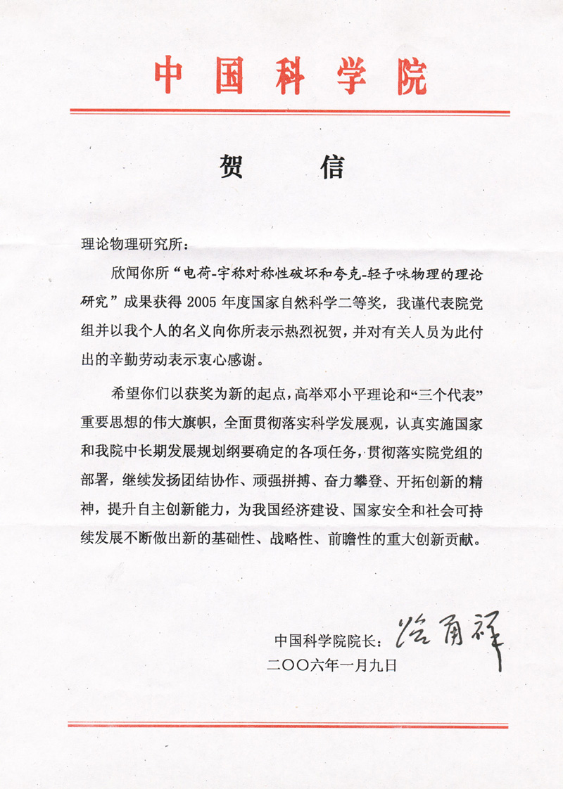 中国科学院院长路甬祥给理论物理所的贺信