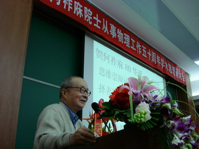 在这次研讨会上,中科院理论物理研究所学术委员会主任欧阳钟灿院士介绍了何先生的学术成就以及对我们国家和中科院理论物理研究所作出的贡献。刘寄星研究员介绍了早年与何先生一起共事的几件事。方守贤院士介绍了他与何先生早期共同为我国加速器发展和高能物理进行长期不懈努力,经受住了我国加速器项目八上七下艰辛考验的历程。张宗烨院士介绍了何先生当年作为研究组的支部书记如何在艰苦的环境下保护大家开展科研工作的情节。陈和生院士介绍了何先生为高能物理做出的贡献。黄祖洽院士用一首诗(附后)概括了何先生的贡献和个性特征。朱邦芬院士介绍了何先生作为清华校友为清华大学做出的贡献。孙汉城先生介绍了何先生在核能理论与实践中发挥的作用。黄涛研究员介绍了何先生在复合场理论方面的工作。