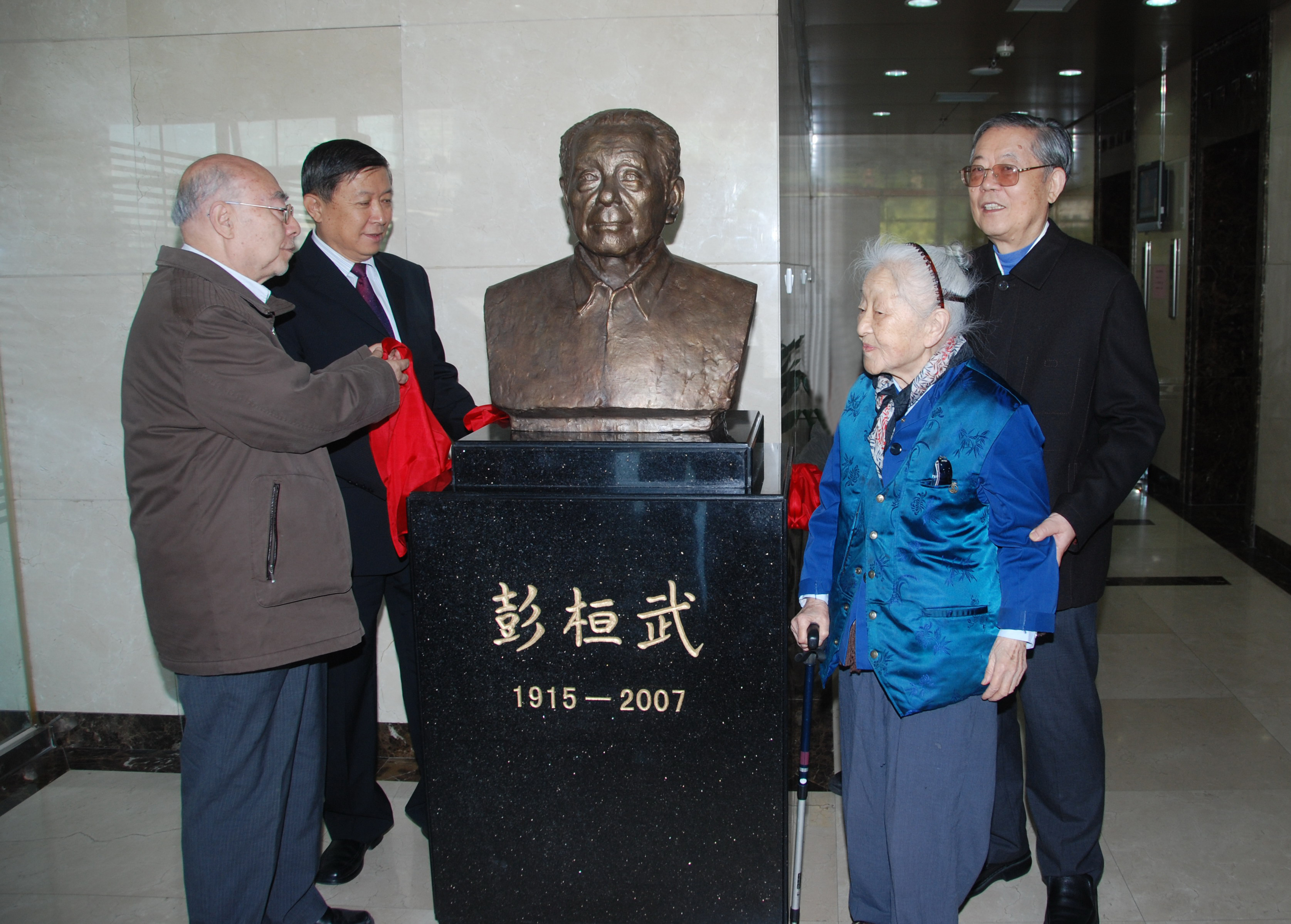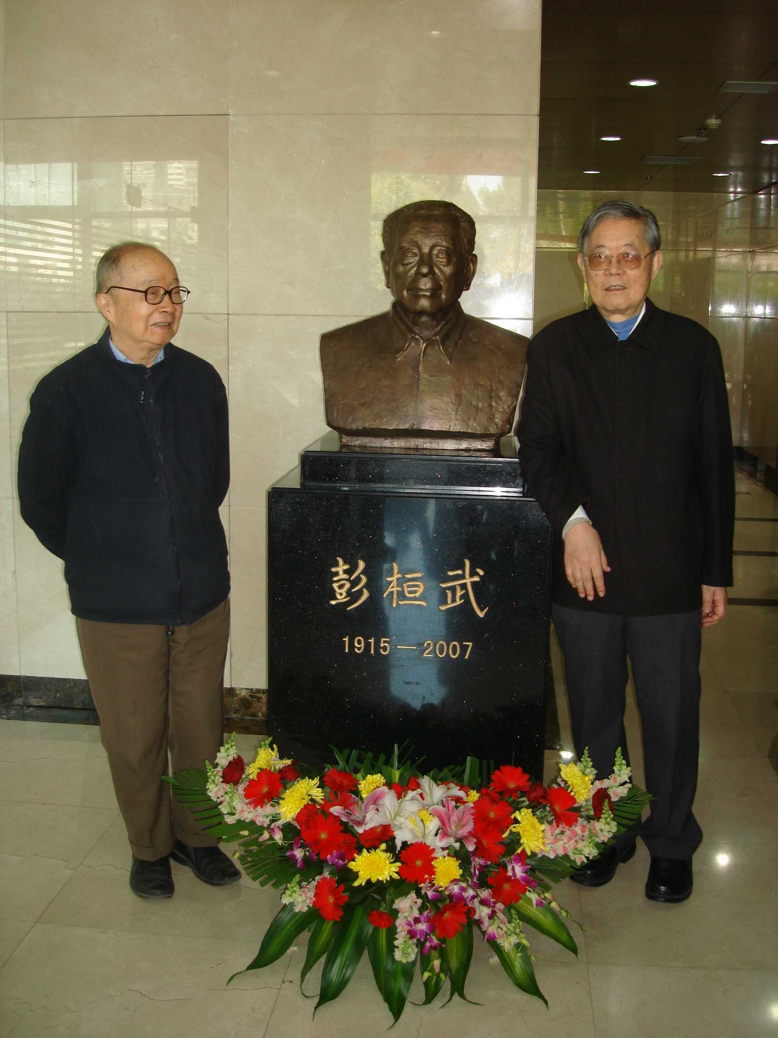 10月12日上午,我国著名理论物理学家、“两弹一星”元勋彭桓武先生铜像揭幕仪式在中科院理论物理所举行。两弹一星功勋奖获得者、中国科协名誉主席周光召院士,何泽慧院士,全国政协科教文委主任、原科技部部长徐冠华院士,两弹一星功勋奖章获得者于敏院士一起为铜像揭幕。以彭桓武先生名字命名的“彭桓武理论物理学奖学金”也同时设立。中国工程物理研究院原院长胡思德院士等出席了揭幕仪式。著名物理学家、诺贝尔物理奖获得者李政道先生专门为彭先生铜像揭幕送来花篮。