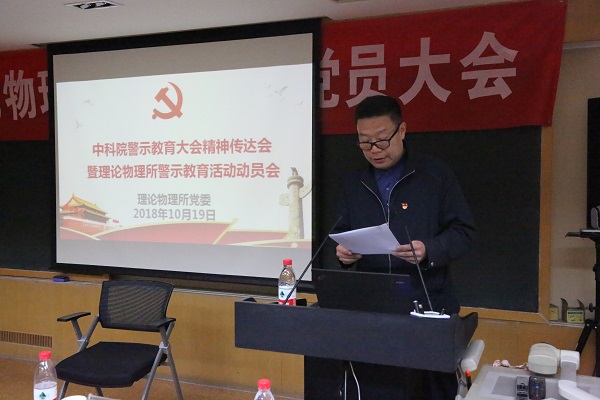 10月19日上午,理论物理所党委召开全体党员大会,党委书记冯稷同志传达了中科院警示教育大会精神,通报了中科院所属单位党员干部违纪典型案例,对全所党员同志进行了警示教育,要求党员同志以案为鉴、警钟长鸣,用身边事警示自己,筑牢拒腐防变的思想道德防线,同时对理论物理所开展集中警示教育活动进行了动员部署。 根据中科院党建工作领导小组办公室关于集中开展警示教育活动的通知要求,理论物理所党委制定了开展集中警示教育活动方案,将10月16日至10月31日期间作为理论物理所警示教育活动月集中活动时间,通过召开党委理论中心组专题学习扩大会、党支部专题学习会、网络答题、观看视频辅导、党员自学等形式,广泛开展多种形式警示教育活动。