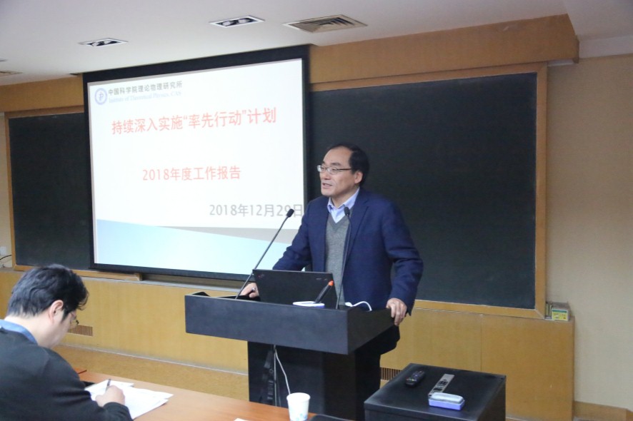 2018年12月29日,理论物理所组织召开职工大会,蔡荣根同志代表所领导班子做2018年度工作总结,报告本年度发挥职能作用情况和重点工作完成情况。北京分院张鸿翔副院长、北京分院人事处柳岸副处长出席了会议。 蔡荣根从科研工作进展、人才队伍建设、财务运行、党建与创新文化等方面报告了2018年研究所总体工作以及2019年要点。他指出,2018年理论物理所深入学习贯彻习近平新时代中国特色社会主义思想和党的十九大精神,认真落实院党组部署,围绕科学前沿、国家战略需求,调整科研布局和战略规划,深入实施“率先行动”计划,推进研究所“一三五”规划落实。顺利完成院党组对理论物理所的巡视整改,进一步加强了党的领导、党组织建设和研究所的制度建设和执行。 2018年是“改革开放”、“科学春天”40周年、理论物理所也成功举办了建所40周年纪念活动,回顾了“开放办所”40年来取得的成就和宝贵经验,完成了党委纪委换届,在党政班子和全所职工的共同努力下,科研、人才、党建等各方面工作迈上新台阶。他希望广大职工牢记建所初心,继续开创理论物理所的新辉煌。根据党风廉政建设年度工作安排,蔡荣根在全所职工大会上做了反腐倡廉警示教育,用巡视反馈案例以及院属单位案例警示全所职工牢记廉洁自律各项纪律。 随后参加测评人员对领导班子和班子成员进行了民主测评。