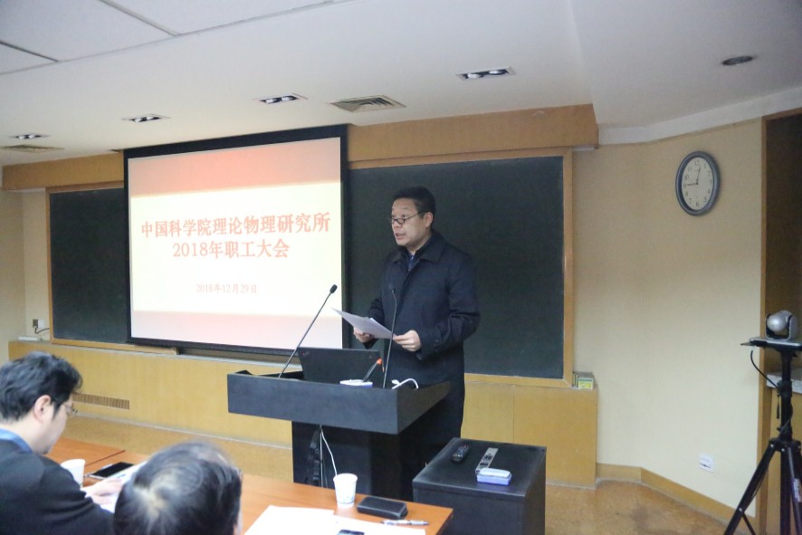 2018年12月29日,理论物理所组织召开职工大会,蔡荣根同志代表所领导班子做2018年度工作总结,报告本年度发挥职能作用情况和重点工作完成情况。北京分院张鸿翔副院长、北京分院干部人事处柳岸副处长出席了会议。 蔡荣根从科研工作进展、人才队伍建设、财务运行、党建与创新文化等方面报告了2018年研究所总体工作以及2019年要点。他指出,2018年理论物理所深入学习贯彻习近平新时代中国特色社会主义思想和党的十九大精神,认真落实院党组部署,围绕科学前沿、国家战略需求,调整科研布局和战略规划,深入实施“率先行动”计划,推进研究所“一三五”规划落实。顺利完成院党组对理论物理所的巡视整改,进一步加强了党的领导、党组织建设和研究所的制度建设和执行。 2018年是“改革开放”、“科学春天”40周年、理论物理所也成功举办了建所40周年纪念活动,回顾了“开放办所”40年来取得的成就和宝贵经验,完成了党委纪委换届,在党政班子和全所职工的共同努力下,科研、人才、党建等各方面工作迈上新台阶。他希望广大职工牢记建所初心,继续开创理论物理所的新辉煌。根据党风廉政建设年度工作安排,蔡荣根在全所职工大会上做了反腐倡廉警示教育,用巡视反馈案例以及院属单位案例警示全所职工牢记廉洁自律各项纪律。 随后参加测评人员对领导班子和班子成员进行了民主测评。