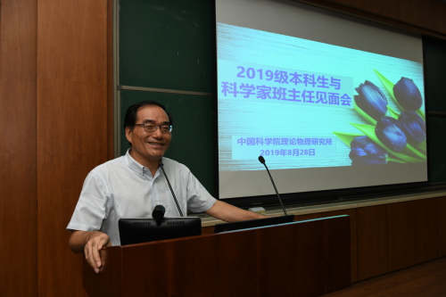 随后,蔡老师回顾了自己的求学和工作经历,谦虚地表示虽然自己32年前曾做过班主任,但对于科学家班主任这个位置,仍然心存忐忑,诚惶诚恐。他希望同学们不要因为他是院士而把他想得高高在上,而是把他当作一位普通的朋友,普通的老师,有问题可以多找他交流讨论。随后蔡老师给同学们提出了一些大学生活的建议:首先,他希望同学们能够坚持锻炼,养成良好的生活习惯,健康的身体是生活和工作的基础;其次,他阐述了大学学习和中学学习的差别,希望同学们能够转变心理和学习方式,尽快适应大学学习节奏,不要掉队;第三,他希望同学们除了物理之外,多关注其他学科,尤其是历史、哲学等文科方向,广泛涉猎; 最后,他希望同学们能够培养与人良好交流和沟通的能力及习惯,多参与群团活动。一个优秀的人才,仅仅有好的学习能力是不够的,还要有与人打交道的能力。