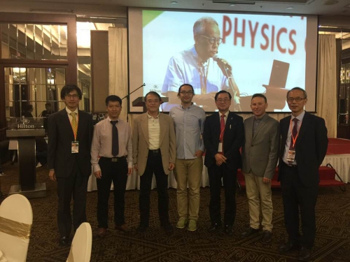 获奖者与嘉宾合影(左起:Junichi Yokoyama、刘雄军、 Misao Sasaki、何颂、Mitsuru Kikuchi、 Igor Aharonovich、YK Bang)